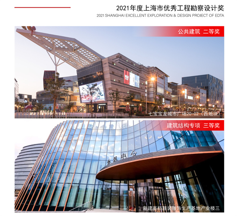 2021-07-232021年度上海市优秀工程勘察设计项目评选已经领导小组审议通过,共有488个项目入围。经过评审专家层层严格的审核,CCDI悉地国际2项优秀作品获奖,其中“七宝宝龙城市广场20-02(西地块)”荣获公共建筑二等奖,“新建高档服装服饰生产基地产业楼三”荣获建筑结构专项三等奖。