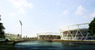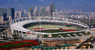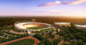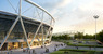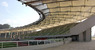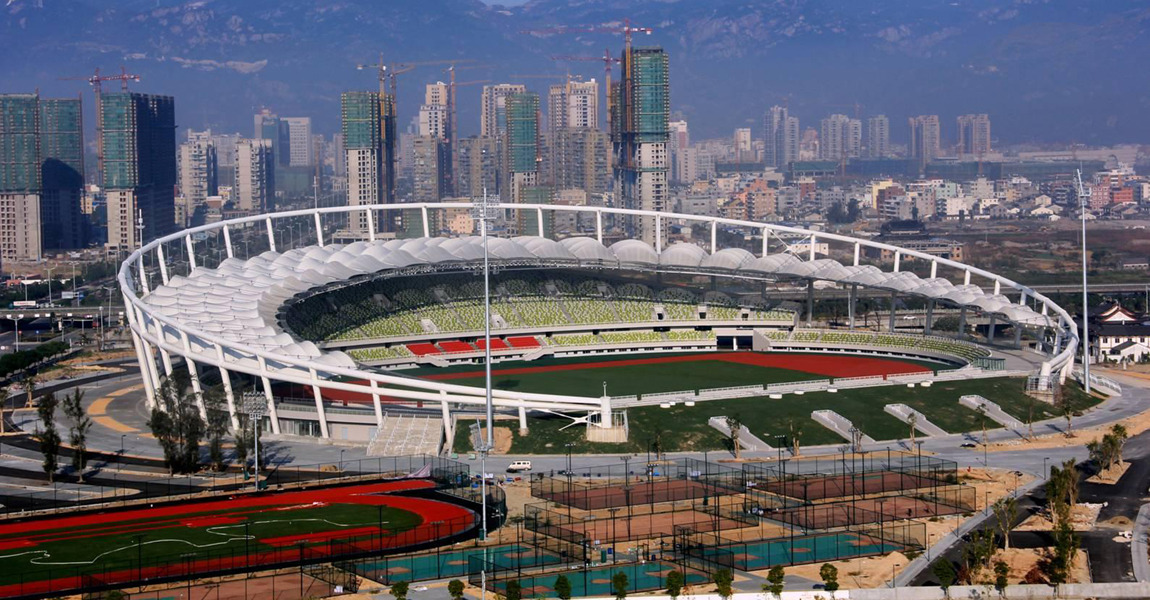 体育场设计理念源于水面涟漪的动态,层层水波推开呈月牙状,强调开放性和景观的渗透。开放式的体育场,外立面高度通透,大部分的观众座席布置在视线最佳的西侧看台,拥有观看比赛和遥望远处海景以及公园内其他景色的绝佳视野。体育场的罩棚采用空间索桁体系覆盖PTFE膜材,和月牙形建筑形式有机的结合,达到力与美的高度统一。