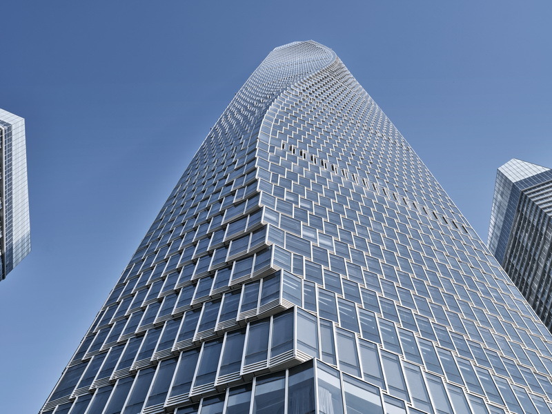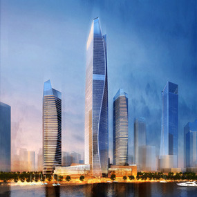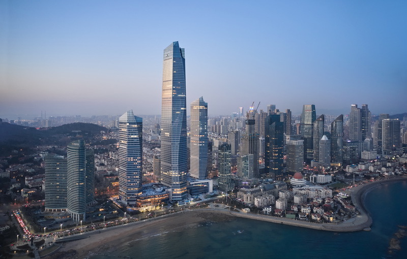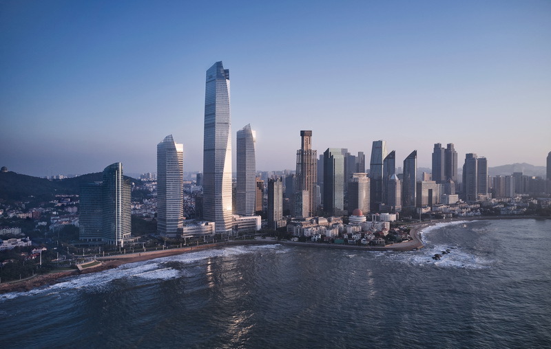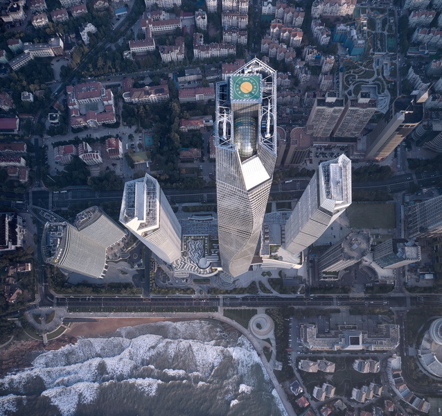 一期规划新建三座塔楼及裙房,三座塔楼功能分别为五星级酒店、超五星酒店和写字楼、酒店式公寓,裙楼规划建设商业、酒店配套及后勤配套设施。新建的三栋超高层塔楼功能包括五星级酒店、六星级酒店和写字楼、公寓式酒店,商业,会议中心。设计沿用基于老海天六边形的平面轮廓,立面元素提取老海天酒店的精华设计语言,用近似的比例及色彩关系呼应老海天的肌理印记,同时以简洁有力的手法表达“ 海之韵“ 的设计理念。现代的建筑手法融合老海天的气质元素,369m 的海天中心将给青岛市民带来一个带有老建筑记忆的新城市标记。