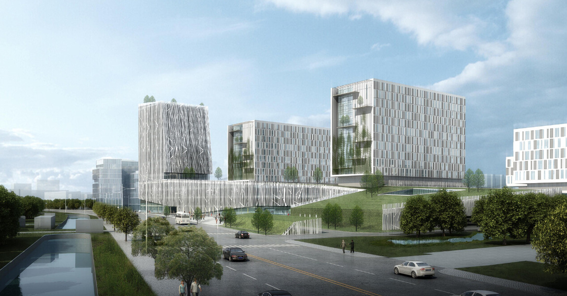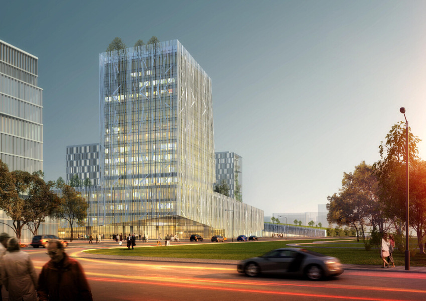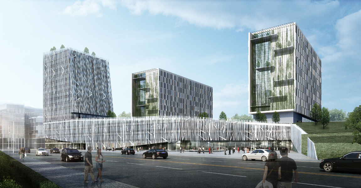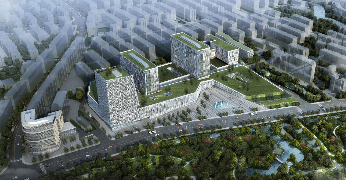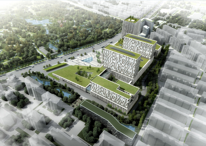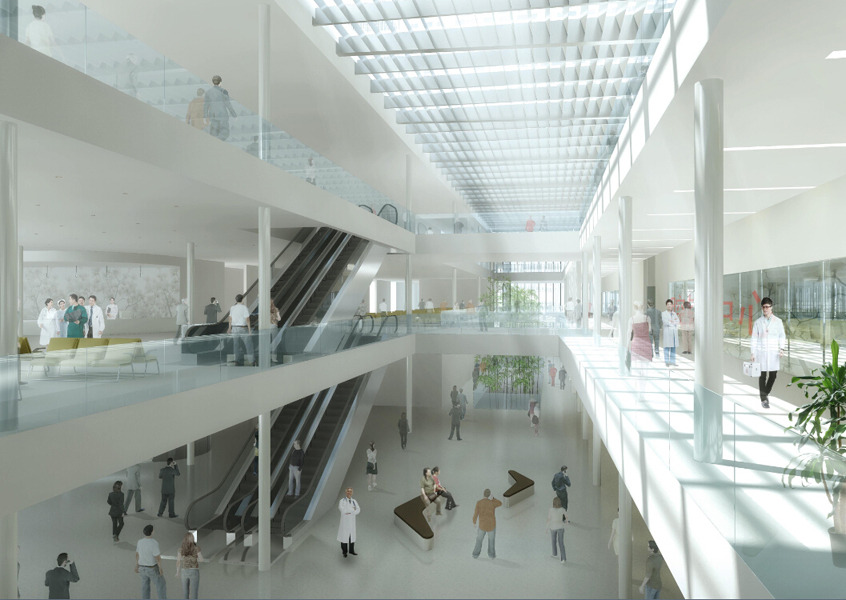 此次设计中从建筑整体形象出发,医院病房楼部分以灰色和白色预制混凝土板和保温材料为外墙围护,窗户为双层low-e玻璃 配以外遮阳百叶,为患者提供舒适的住院空间。裙楼部分以及医疗科研大楼材质以白色喷涂铝合金板和透明双层low-e玻璃为主,同时配以白色镂空喷涂铝合金板遮阳系统,使建筑造型层次丰富,富有变化,达到保温隔热,透光遮阳的效果。为使用者创造舒适节能的工作生活空间。
